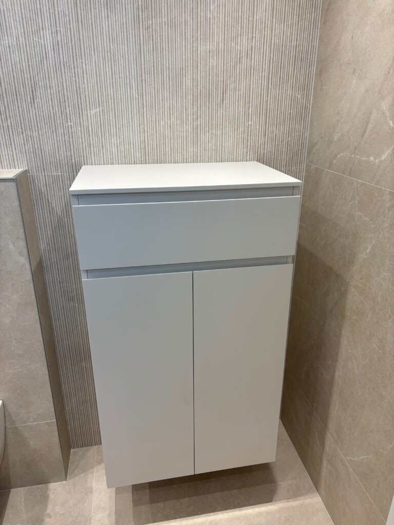 Los acabados y materiales seleccionados se definieron en una gama cromática clara, buscando aportar mayor luminosidad y sensación de amplitud. Esta elección respondía también a la intención de contrastar con el baño anterior, revestido en mármol oscuro, logrando así un ambiente más contemporáneo y equilibrado.